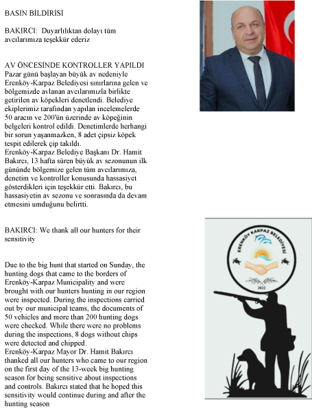 Erenköy-Karpaz Belediye Başkanı Dr. Hamit Bakırcı, KKTC Meclis Başkanı Ziya Öztürkler'e yapılan ziyaretten dolayı teşekkür edilir, bölgesel sıkıntıları ve sorunları anlatma imkanı verildiğinden dolayı memnun olduğu dile getirilir. Bakırcı, Öztürkler'in yediden biri olarak çalıştığını, her zaman katkı koymaya hazır olduğuna inandığını sözlerine ekledi.